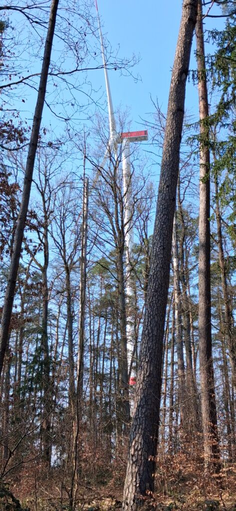 Weit sichtbar steht seit dem Jahr 2025 dieser Windriese auf dem Bretzenstein im nördlichen Landkreis Hassberge. Seine Maße übertreffen die zwei alten, inzwischen stillgelegten Windräder gewaltig. Über 6000 Haushalte können dadurch mit Strom versorgt werden. Von seinem Standort aus können wir weit in das Itztal schauen, sowie hinüber zum Staffelberg und dem Kloster Banz . Bevor wir aber oben angekommen sind, geht es bis an die ersten Häuser einer ehemaligen Garnisonsstadt und Kreisstadt. Über eine frühere Handelsstraße erreichen wir dann die bewaldete Hochebene und sehen unser Ziel schon durch die Bäume schimmern.